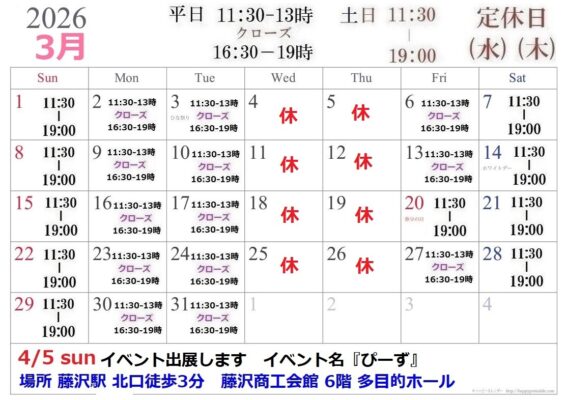 4/5sunは、イベント出展します、お店は休みです。
